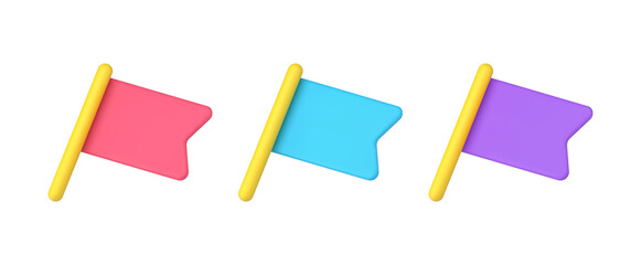 Collection red, blue and purple flag pushpin for location fixing 3d isometric vector illustration