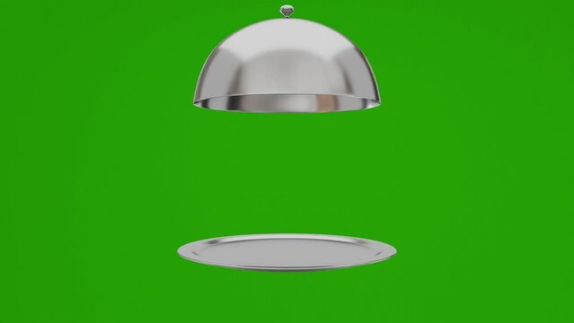 silver restaurant cloche tray lid food cover dish open and close 3d render animation loop on green screen
