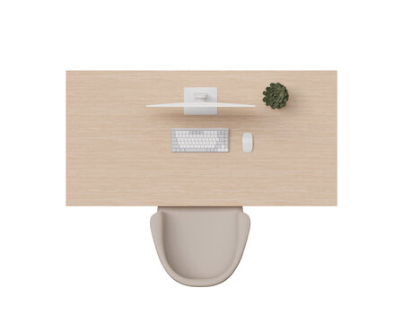 Overhead view of wooden desk and beige chair. Work table on transparent background, PNG. Cut out furniture. Top view. Flat lay, floor plan element. 3D rendering