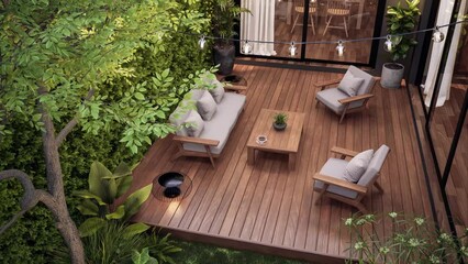 Overhead view of dining set with a wooden table, chairs and decorative plant. Rectangular table on transparent background, PNG. Cut out furniture. Top view. Flat lay, floor plan elements. 3D rendering