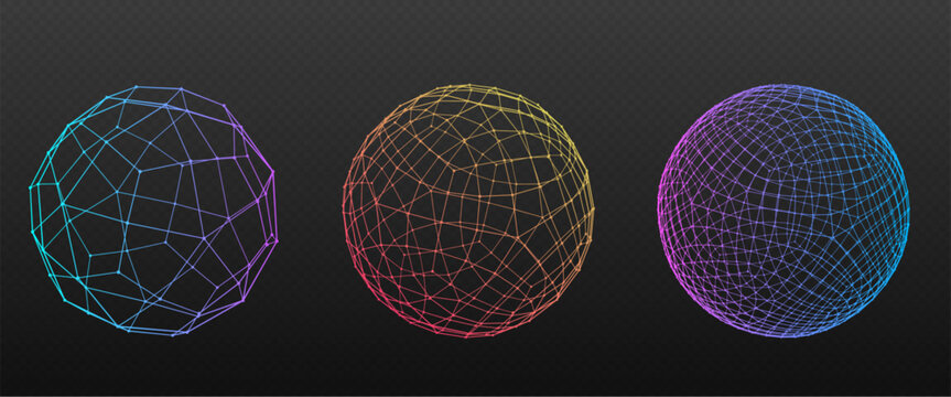 Dot sphere collection - particle globe set on black. Colorful polygonal wireframe balls and triangulated facet orbs. Geometric 3d meshes with lines and points. Minimalist low poly spherical shapes.