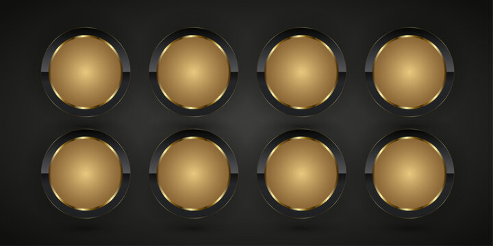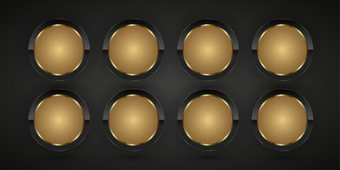 Group of 8 Dark and glod steel elements, Luxury realistic shiny metal buttons. and Eight golden circle buttons on isolated black background