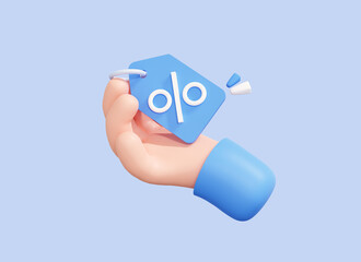 3D Hand holding discount coupon or price tag with percent. Gift voucher and bonus for purchase. Online shopping with sale. Cartoon character. Isolated icon. Blue. 3D Rendering