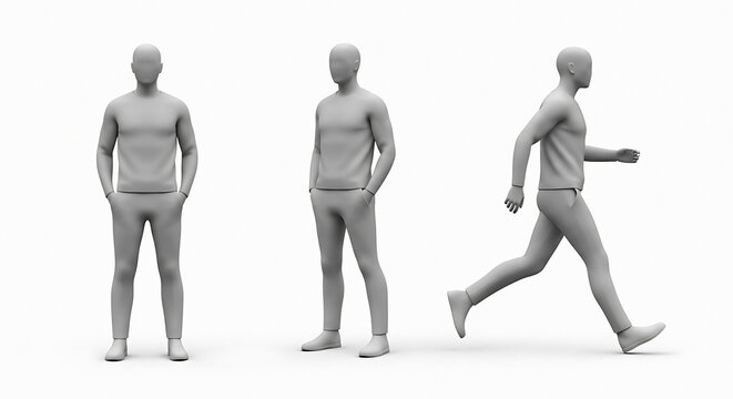 Three full body male mannequin poses standing relaxed walking motion study neutral