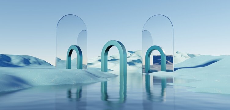 Surreal Beautiful Dream land background. Abstract Dune in winter season landscape with geometric arch. Fantasy island scenery with water and natural cloudy sky. Metallic mirror arch. 3d render.