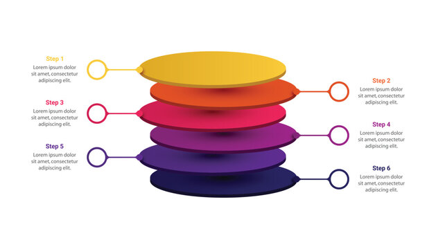 3d round layers stack infographic with 6 steps