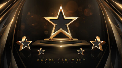 Award ceremony background with 3d gold star and ribbon element and glitter light effect decoration.