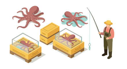 Lighthouse at coast of island with rock and sandy beach in 3d isometric. Sea or ocean yacht at small island wharf. Navigation lighthouse. Beacon tower for marine navigation. Vector illustration