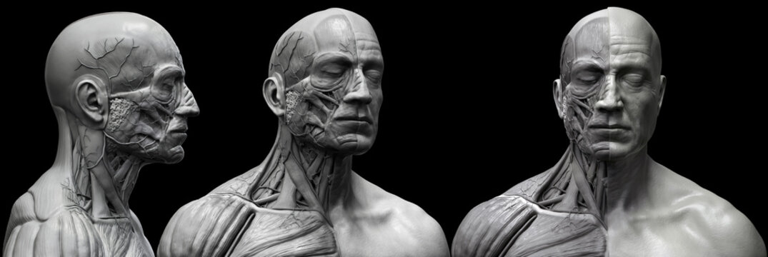 human anatomy skeleton and muscle model, human body anatomy medical illustration, anatomical model of human body with skeleton and muscles, 3d render of human anatomy body structure, half skeleton hal