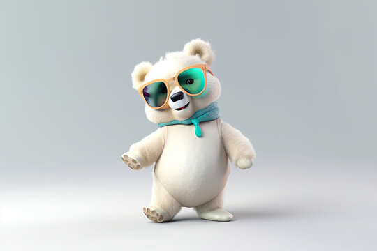 A happy and cool 3D character of a bear with full body, wearing clothes and sunglasses, on a background. Generative AI