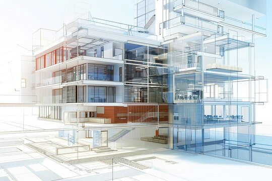 futuristic CAD software interface with blueprint and a modern house in 3d (3d render)