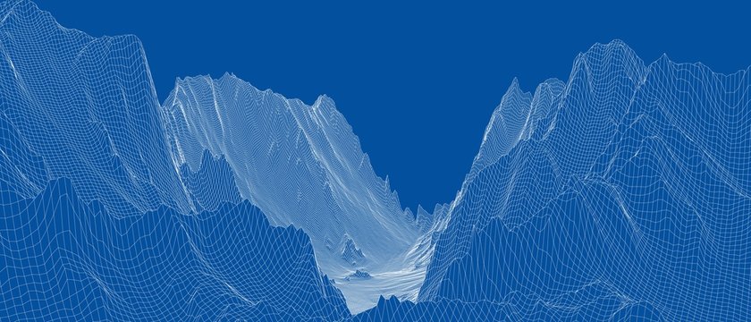 Abstract CG wireframe background. Earth 3d area. 3D grid technology illustration landscape. Digital Terrain Cyberspace in the Mountains with valleys. Blue strock on white colors. Data Array. Vector.
