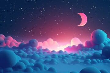 Beautiful realistic flight over cumulus lush clouds in the night moonlight. A large full moon shines brightly on a deep starry night. Cinematic scene. 3d illustration