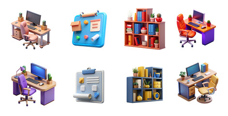 3d office essentials icon set: laptop, chair, printer, and more for productivity