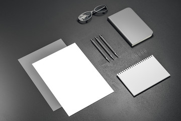 Realistic black mockup. Corporate brand business card letter stationery blank 3D documents brochures. Vector mock up office blank branded badge set