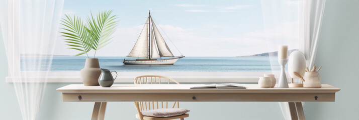 Minimalist home office with a view of the sea, featuring a wooden desk, a chair, and a few decorative items in neutral colors.