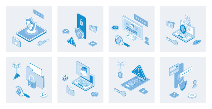 Cyber security 3d isometric concept set with isometric icons design for web. Collection of fingerprint scan verification, password lock access, hacker attack guarding software. Vector illustration