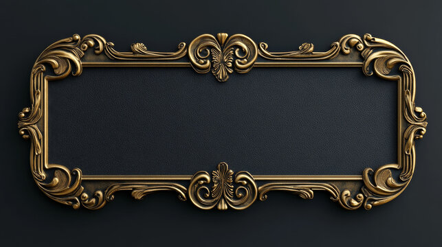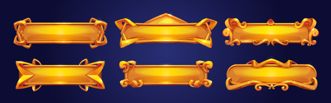 Game ui long button with thin gold frame. Rectangular medieval border with golden metal ornament for title and menu design. 3d vector set of luxury vintage text sign board with art deco elements.