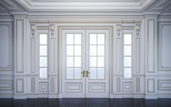 Wall white plastic with gold design hexagon 3d panels. High quality seamless 3d illustration.