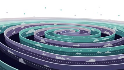 A 3d vector illustration of a film projector lens design featuring a spiral coil concept with hot color accents and a round technology icon symbol