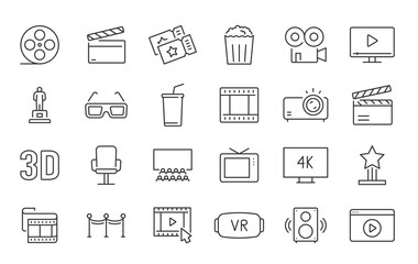 Cinema web icons in line style. Film, popcorn, video, movie theater, 3d, vr, collection. Vector illustration.