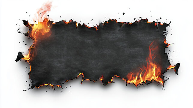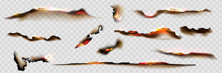 Fire on burnt paper edges. Frames with burn effect with yellow flame, black ash and scorched edges of pages or parchment sheets isolated on transparent background,