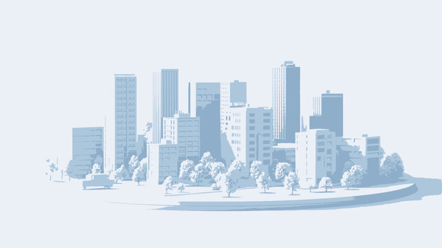 A digital 3D rendering depicts a minimalist cityscape. The image showcases a collection of stylized buildings of varying heights, rendered in shades of white and light gray, arranged on a circular