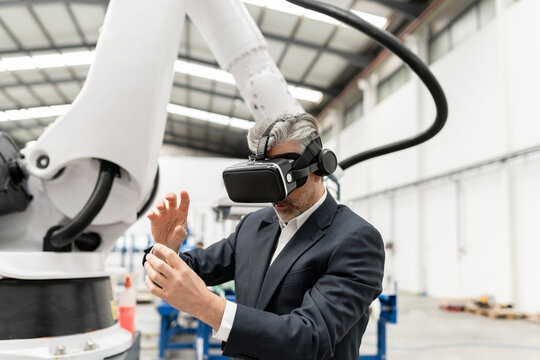 Businessman wearing virtual reality gesturing in factory