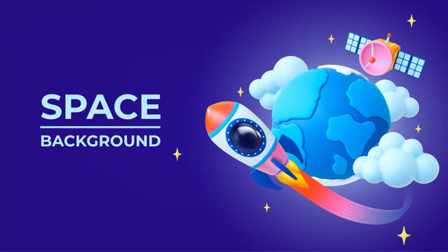 Cartoon 3d space banner. Universe plastic elements, earth planet, satellite and flying spaceship. Cosmic adventures, pithy vector background