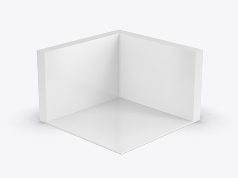 3d empty corner booth room mockup. White wall trade show cube box. Perspective product display space for expo kiosk. Conference stall exhibition area. Store showroom section for small backdrop