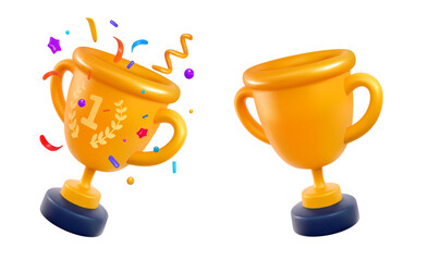 Champion cups set 3d cartoon design elements. Win prize, first place sport competition isolated icons. Cartoon trophy cup on transparent background.
