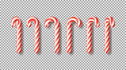 Set of red Xmas candy canes isolated on checkered background. 3d realistic holiday sweets. Templates of candies for Christmas and New Year cards, posters, banners, flyers. Vector illustration.