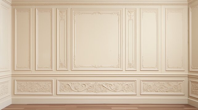 Room interior with white classic wall panel and wooden floor. Light background with luxury elegant molding frames. Realistic 3d vector illustration of home or office design with moulding and parquet
