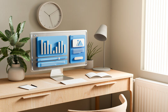 Futuristic 3D of a minimalist workspace with cloud technology enabling digital transformation and innovation  The abstract geometric shapes in blue and pink colors create a modern