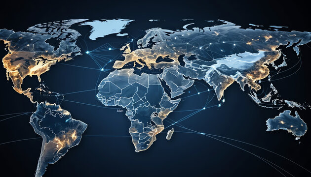 Global interconnectedness, 3D world map, network connections, dark background