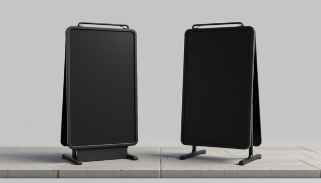 A 3D rendering of a blank black metallic outdoor stand mockup set in front and side views for clear street signage board mock up