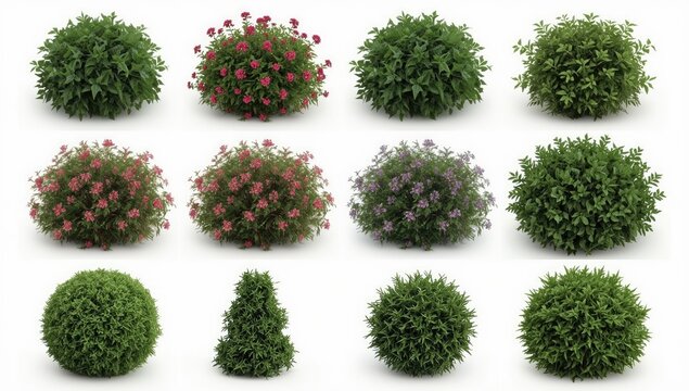 Various landscaping plants in diverse shapes and colors, displayed against a plain white background.