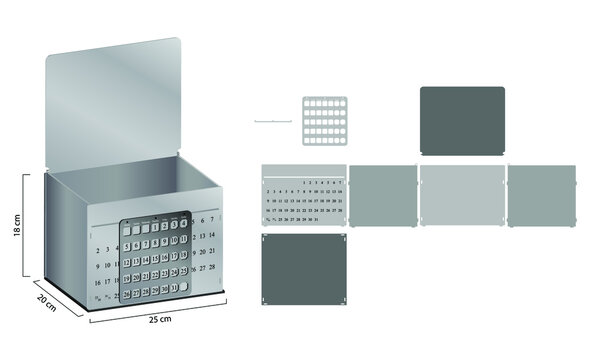 Perpetual calendar box laser cut vector model, Wood, Plywood, Metal calendar box CNC cut file. Corporate and business calendar box. Week Starts Monday.