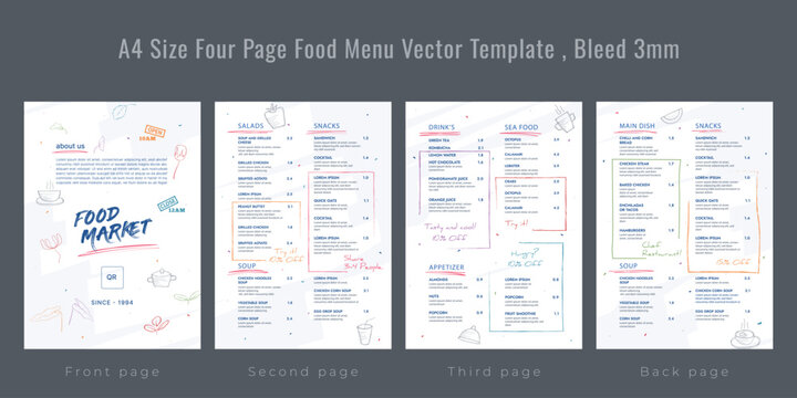 Restaurant cafe menu, template design, A4 size four page food menu template, Bleed 3mm