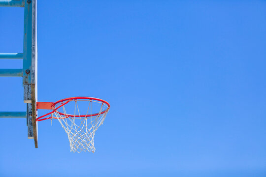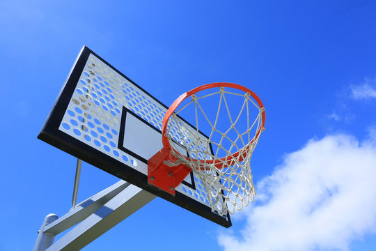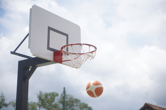 外でストリートバスケット。バスケットゴールにシュートしたボール。