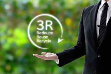 Human male holding a board, 3r concept, reduce nature pollution, reuse materials, recycle and waste management, save the earth environment, go green banner, eco friendly, copy space for text