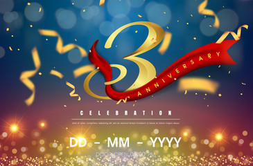 3 years anniversary logo template on gold and blue background. 3rd celebrating golden numbers with red ribbon vector and confetti isolated design elements