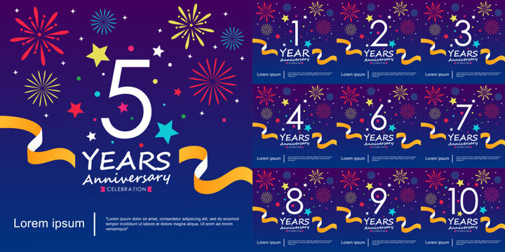 Set of 1-10 years anniversary celebration logo isolated with ribbon, stars and fireworks sparkle twinkle. vector illustration template design for web, flyers, poster, invitation card, greeting card