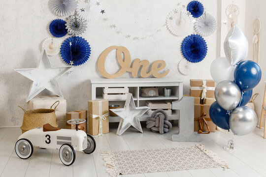 Birthday decorations - gifts, toys, balloons, garland and figure for little baby party on a white wall background.