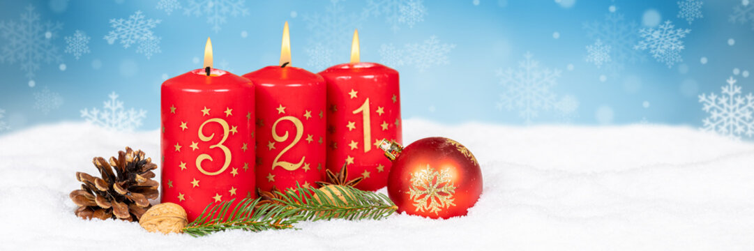Third 3rd Sunday in advent with burning candle panorama Christmas card time winter background with copyspace copy space
