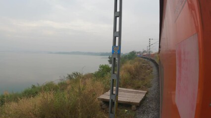 3rd December, 2023, Singapore Road, Orisa, India: A yellow long Indian railway diesel locomotive passenger train in countryside of dooars area on curvy stretch of track with selective focus.