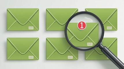A set of green digital documents arranged in a 3x2 grid with a magnifying glass focusing on one,
