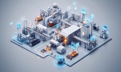 Industry 4, 0 smart factory interior showcases advanced automation, machinery, and robotics in a futuristic industrial setting