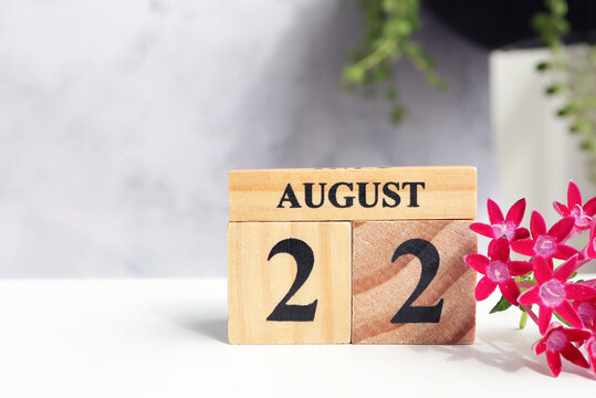 Hello August, Cube wooden calendar showing date on 22 August. Wooden calendar with date on a light background.