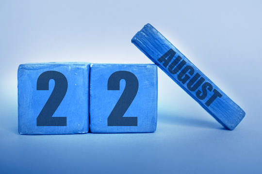 august 22nd. Day 22 of month, Handmade wood cube calendar with date month and day in trendy classic blue color of the year summer month, day of the year concept